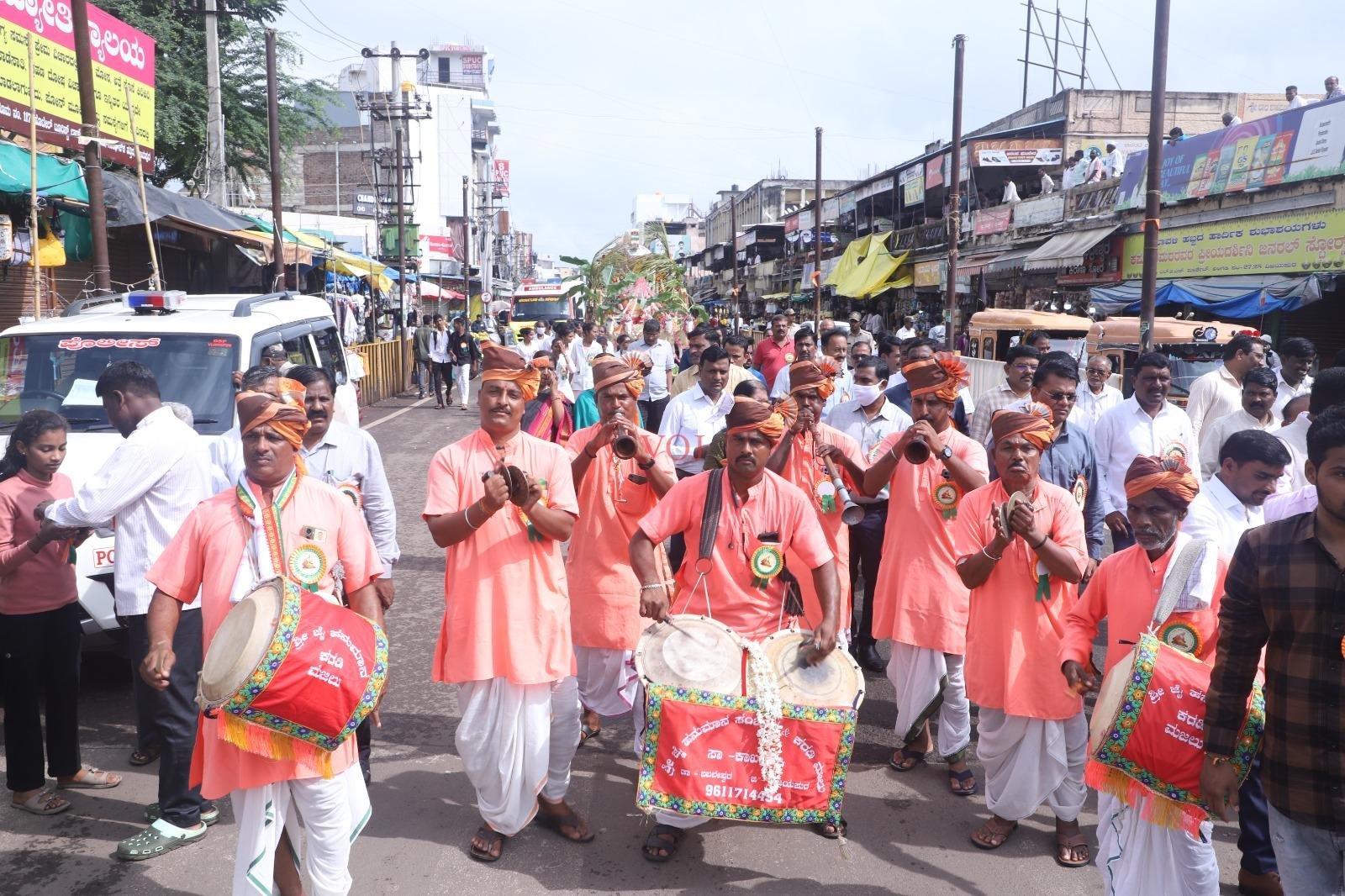 ಮೆರವಣಿಗೆಯೂ ನಗರದ ಲಾಲ್ ಬಹದ್ದೂರ್ ಶಾಸ್ತಿç ಮಾರುಕಟ್ಟೆ ರಸ್ತೆ ಮೂಲಕ, ಗಾಂಧಿ ವೃತ್ತ, ಬಸವೇಶ್ವರ ವೃತ್ತ, ಡಾ.ಬಿ.ಆರ್. ಅಂಬೇಡ್ಕರ್ ವೃತ್ತ, ಕನಕದಾಸ ವೃತ್ತದ ಮೂಲಕ ರಂಗಮಂದಿರ ತಲುಪಿತು. ಮೆರವಣಿಗೆಯಲ್ಲಿ ಗೊಂಬೆ ಕುಣಿತ, ಕರಡಿ ಮಜಲು ಸೇರಿದಂತೆ ವಿವಿಧ ವಾದ್ಯಮೇಳ ಹಾಗೂ ಕಲಾ ತಂಡಗಳು ಆಕರ್ಷಕ ಪ್ರದರ್ಶನ ನೀಡಿದರು.