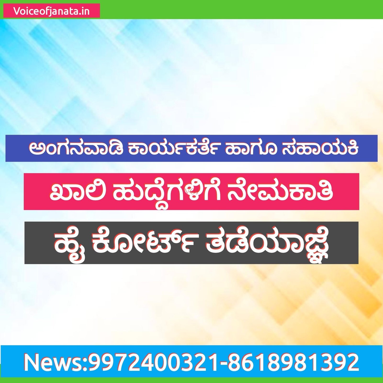 ಇಂಡಿ : ಜಿಲ್ಲೆಯಲ್ಲಿ ಅಂಗನವಾಡಿ ಕಾರ್ಯಕರ್ತೆ ಹಾಗೂ ಸಹಾಯಕಿ ಖಾಲಿ ಹುದ್ದೆಗಳಿಗೆ ನೇಮಕಾತಿ ಮಾಡಿಕೊಳ್ಳಲು ಜಿಲ್ಲೆಯ ಉಪ ನಿರ್ದೇಶಕರು ಮಹಿಳಾ ಮತ್ತು ಮಕ್ಕಳ ಅಭಿವೃದ್ಧಿ ಇಲಾಖೆಯಿಂದ ಅರ್ಜಿ ಆಹ್ವಾನಿಸಲಾಗಿದ್ದು, ಅದನ್ನು ಕಲ್ಬುರ್ಗಿ ಹೈ ಕೋರ್ಟ್ ತಡೆಯಾಜ್ಞೆ ನೀಡಿ ಆದೇಶ ಹೊರಡಿಸಿದೆ.