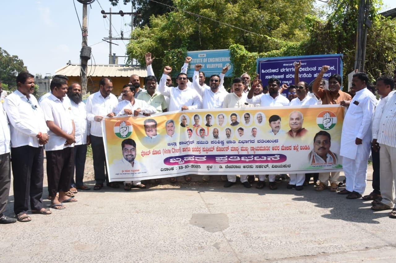 ಇದೇ ವೇಳೆ ಸುಪ್ರೀಂ ಕೋರ್ಟ ಮುಖ್ಯ ನ್ಯಾಯಾಧೀಶರ ಮೇಲೆ ಶೂ ಎಸೆದ ವಕೀಲನ ವಿರುದ್ಧ ಮತ್ತು ಕೇಂದ್ರ ಸರ್ಕಾರದ ಆಡಳಿತ ವೈಫಲ್ಯದ ವಿರುದ್ಧ ಬೃಹತ್ ಪ್ರತಿಭಟನೆಯನ್ನು ನಗರದ ಡಿ.ದೇವರಾಜ ಅರಸು ವೃತ್ತದಲ್ಲಿ ನಡೆಸಲಾಯಿತು.ಈ ಸಂದರ್ಭದಲ್ಲಿ ಜಿಲ್ಲಾ ಕಾಂಗ್ರೆಸ್ ಅಧ್ಯಕ್ಷರಾದ ಮಲ್ಲಿಕಾರ್ಜುನ ಎಸ್. ಲೋಣಿ ಅವರು ಮಾತನಾಡಿ ಇವತ್ತು ಮತಗಳ್ಳತನ ಮಾಡುವುದರ ಮೂಲಕ ಕೇಂದ್ರದಲ್ಲಿ ಬಿಜೆಪಿ ಸರಕಾರ ಅಧಿಕಾರಕ್ಕೆ ಬಂದಿದೆ ಹಾಗೂ ನಮ್ಮ ವಿಜಯಪುರ ನಗರದಲ್ಲಿಯೂ ಕೂಡ ಮತಗಳ್ಳತನ ಮಾಡಲಾಗಿದೆ ಎಂದು ಹೇಳಿದರು. ಜಿಲ್ಲಾ ಕಾಂಗ್ರೆಸ್ ಪರಿಶಿಷ್ಟ ಜಾತಿ ವಿಭಾಗದ ಅಧ್ಯಕ್ಷರಾದ ರಮೇಶ ಗುಬ್ಬೇವಾಡ ಮಾತನಾಡಿ ಸುಪ್ರೀಂ ಕೋರ್ಟ ಮುಖ್ಯ ನ್ಯಾಯಾಧೀಶರ ಮೇಲೆ ಶೂ ಎಸೆಯಲು ಪ್ರಯತ್ನಿಸಿರುವದು ಅತ್ಯಂತ ಹೀನಕೃತ್ಯ. ಇದು ಒಬ್ಬ ವ್ಯಕ್ತಿಯ ಅವಮಾನ ಅಲ್ಲ ನಮ್ಮ ದೇಶದ ನ್ಯಾಯಾಂಗಕ್ಕೆ ಆದ ಅವಮಾನ. ಸಂವಿಧಾನದ ಮೌಲ್ಯಗಳು ಮತ್ತು ಕಾನೂನಿನ ಶ್ರೇಷ್ಠತೆಯ ಮೇಲಿನ ದಾಳಿಯಾಗಿದೆ. ಆದ್ದರಿಂದ ತಪ್ಪಿತಸ್ಥ ವಕೀಲನ ಮೇಲೆ ಕಾನೂನು ರೀತಿ ಕಠಿಣಕ್ರಮ ಆಗಬೇಕೆಂದು ಒತ್ತಾಯಿಸಿದರು.ಇದೇ ಸಂದರ್ಭದಲ್ಲಿ ಶಕೀಲ ಬಾಗಮಾರೆ ಮಾತನಾಡಿದರು. ಪ್ರತಿಭಟನಾ ಕಾರ್ಯಕ್ರಮದಲ್ಲಿ ಚಾಂದಸಾಬ ಗಡಗಲಾವ, ದೇಸು ಚವ್ಹಾಣ, ವಸಂತ ಹೊನಮೊಡೆ, ರಾಕೇಶ ಕಲ್ಲೂರ, ಮಹಾದೇವ ಛಲವಾದಿ, ಕೃಷ್ಣಾ ಲಮಾಣಿ, ಕೃಷ್ಣಾ ಕಾಮಟೆ, ಮಲ್ಲಿಕಾರ್ಜುನ ಮಡ್ಡಿಮನಿ, ಮುತ್ತು ಬತ್ತಾಸೆ, ಪರಶುರಾಮ ಜಮಖಂಡಿ, ವಿಠ್ಠಲ ಸಂದಿಮನಿ, ಮಹಾದೇವ ಲಿಂಗದಳ್ಳಿ, ಬಸವರಾಜ ಛಲವಾದಿ, ಮಲ್ಲು, ಭಾರತಿ ಎಂ. ಹಡಪದ, ಹರೀಶ ಕೌಲಗಿ, ಕಣಮುಚನಾಳ, ಧರ್ಮರಾಜ ಹೊಸೂರ, ಸರ್ಫರಾಜ ಅಗಸಬಾಳ, ಲಕ್ಷಿö್ಮ ಕ್ಷೀರಸಾಗರ, ಗುಲಾಬ ಚವ್ಹಾಣ, ಅಬಿದ ಇಲಕಲ್, ಬಿ.ಎಂ. ಮಕ್ತೇದಾರ, ಹಮಿದಾ ಪಟೇಲ, ಸುನಂದಾ ಯಂಪೂರೆ, ರೇವಪ್ಪ ಬತ್ತಾಸೆ, ಸಿದ್ದು ಹಿರೇನಾಯಕ, ವೆಂಕಟೇಶ ಕಲಾಲ, ಮಾನಿಂಗ ಜವನರ, ಪರಸು ಡೊಳ್ಳಿ, ಲೋಕೇಶ ಜವನರ, ನದಾಫ, ಎಸ್.ಎಂ. ನಾಗಠಾಣ ಮುಂತಾದವರು ಉಪಸ್ಥಿತರಿದ್ದರು.